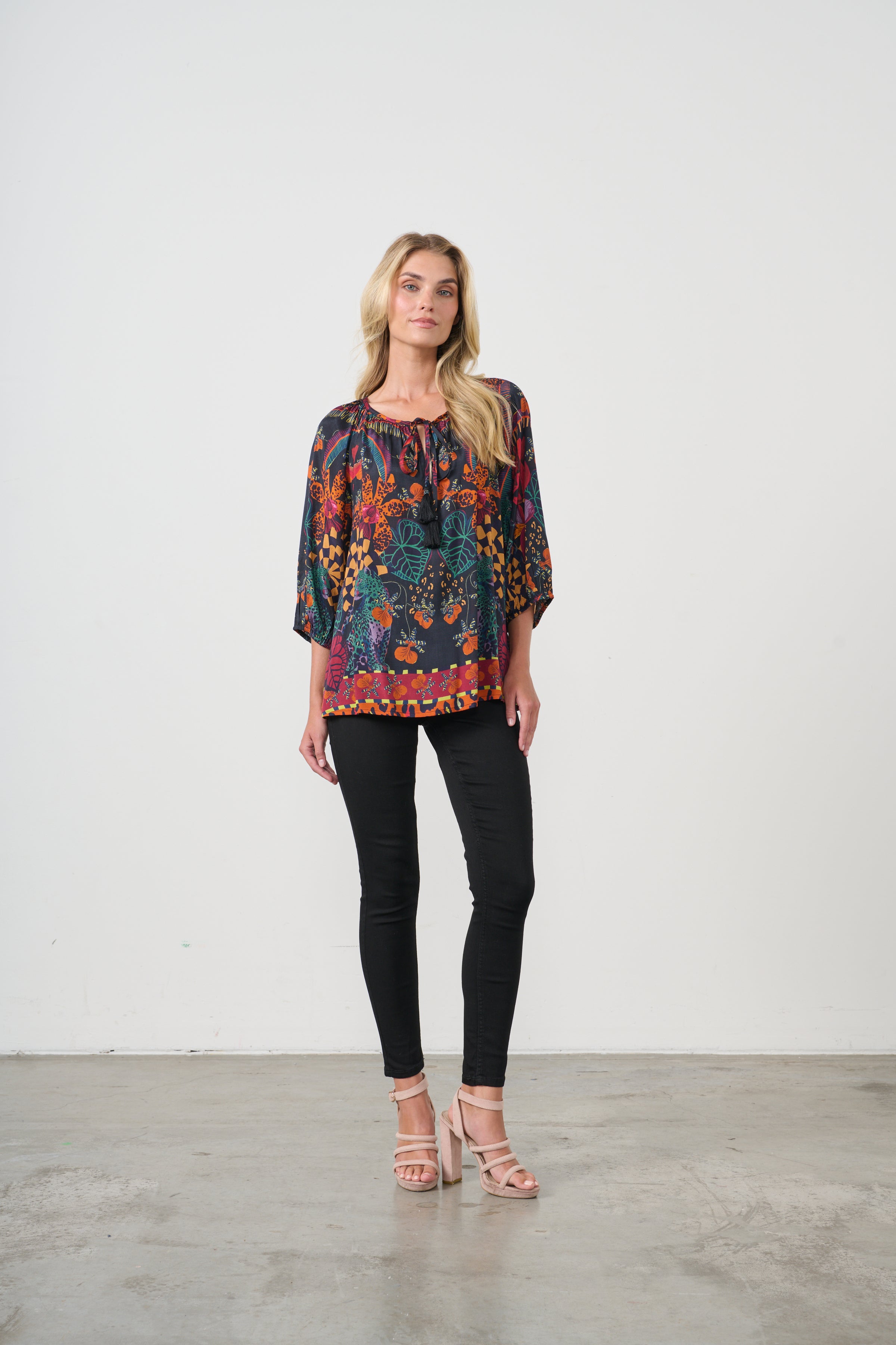 Crafted from 100% viscose, this vibrant multi-print top drapes beautifully and feels light against the skin. The relaxed fit, flowing sleeves, and tie neckline create an effortless boho vibe, while the rich mix of colours makes it a standout piece. Perfect with jeans, pants, or skirts for easy day-to-night style.
