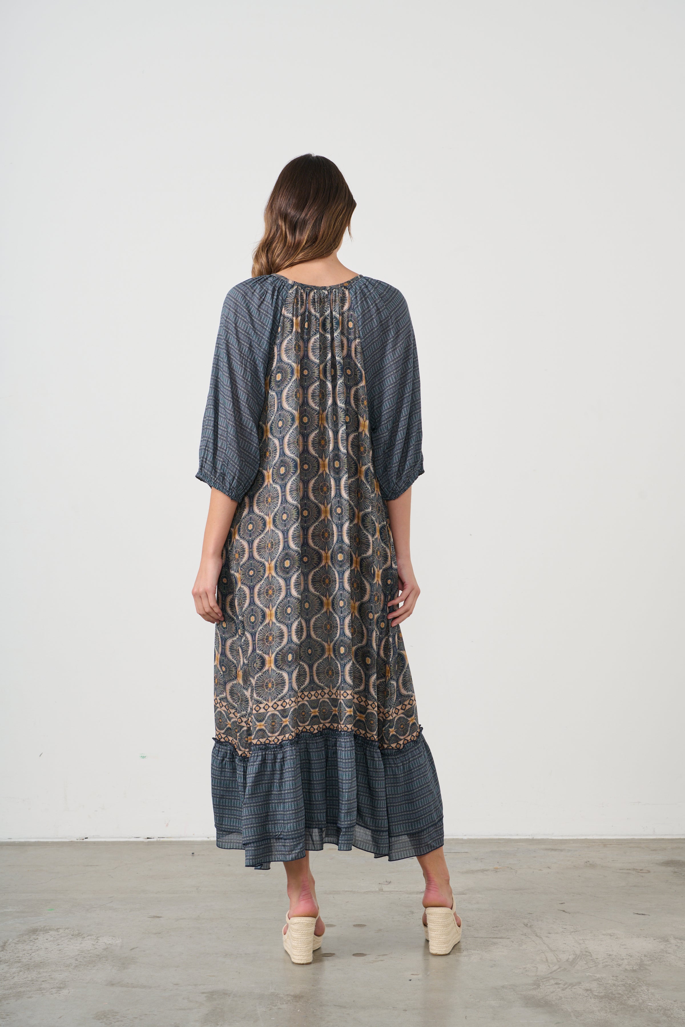 Soft, fluid, and effortlessly chic, this dress is crafted from 100% viscose modal for a luxurious feel and beautiful drape. Featuring a striking geometric print, ¾ raglan sleeves, and a tiered hem, it blends comfort with a touch of boho elegance—perfect for day-to-evening wear.