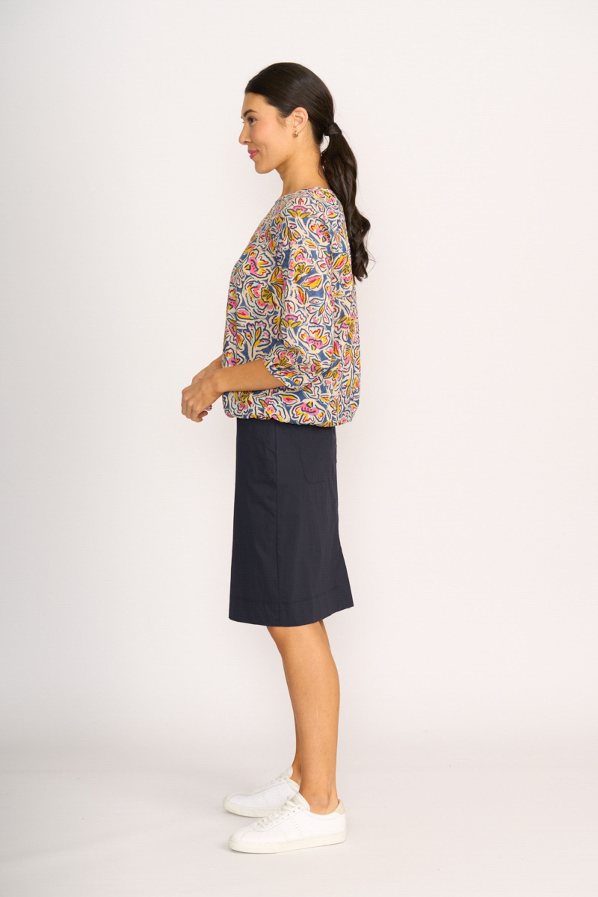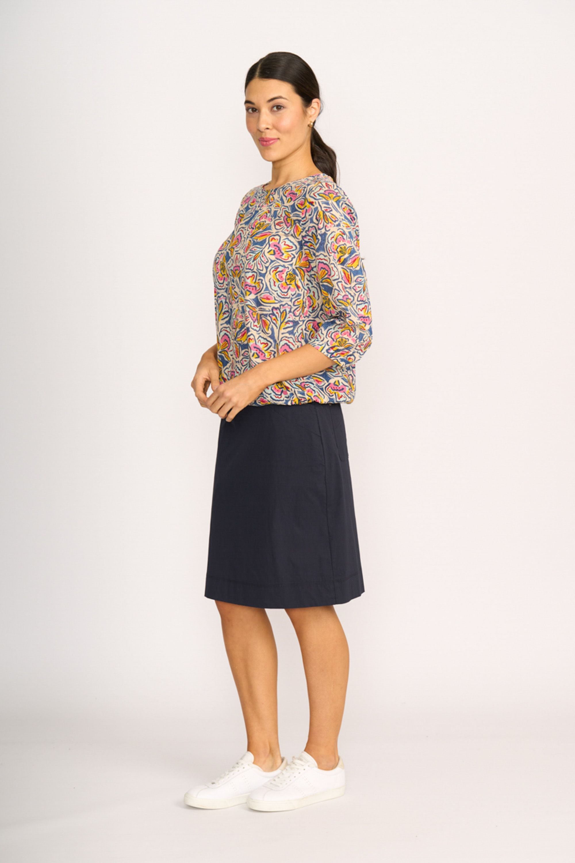 Classic and comfortable pull on skirt. Back patch pockets and front pockets for all you need to carry. Length including the waistband taken at the side seam is approx. 58cm (size 12) BATTEN 69% COTTON, 27% NYLON, 4% ELASTANE