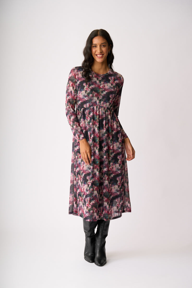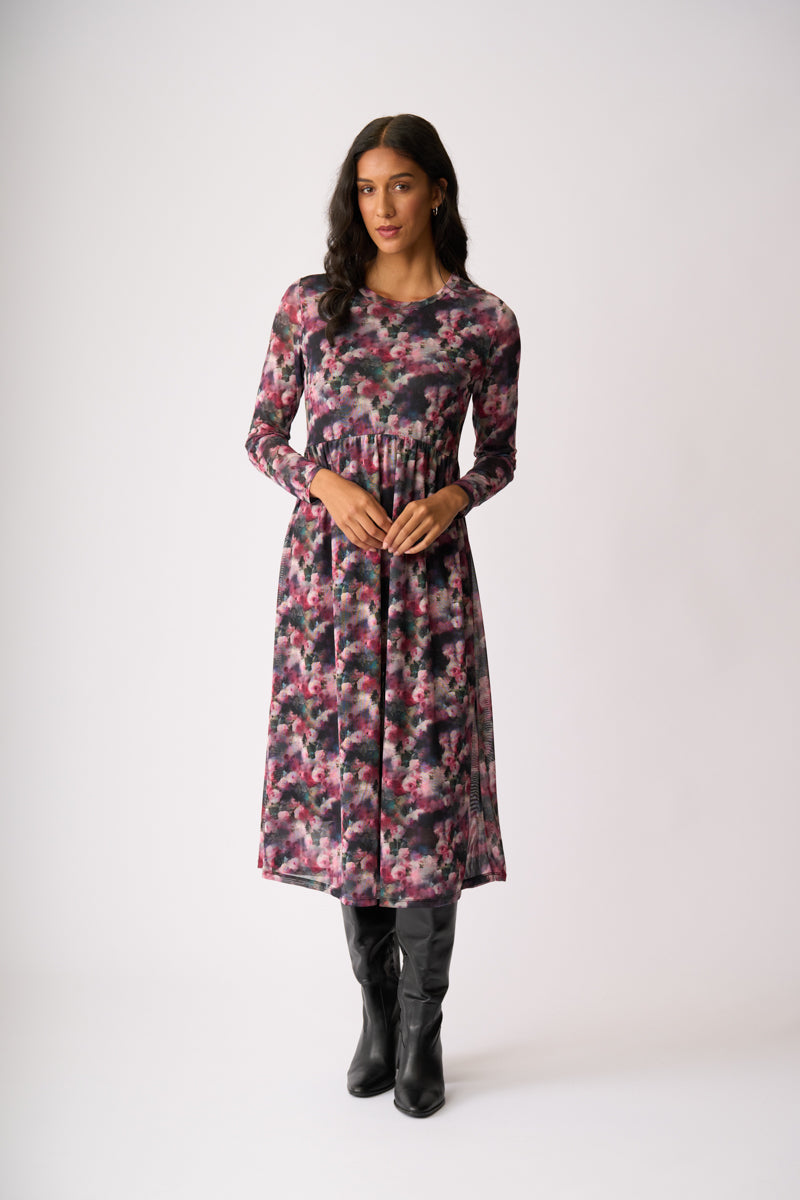 Soft, feminine and beautifully easy to wear, this winter floral dress is designed for comfort with a flattering silhouette. Featuring a classic crew neckline, long sleeves, and a gently gathered waist, it falls effortlessly through the skirt for a graceful drape. The moody floral print adds depth and warmth, making it perfect for cooler days. Style it with boots and a jacket for everyday wear, or dress it up for an easy day-to-evening look.